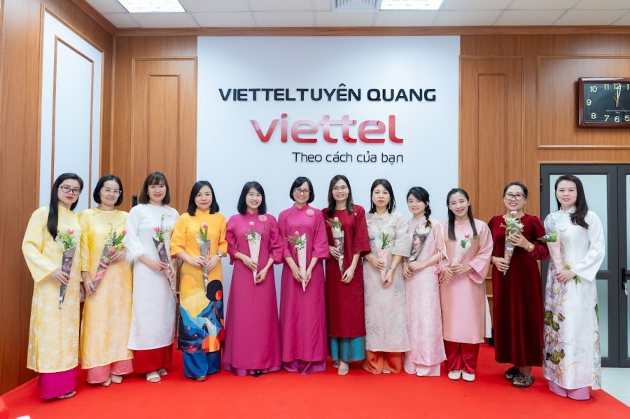 Trong "Tuần lễ áo dài", nữ cán bộ nhân viên Viettel Tuyên Quang rạng rỡ trong những bộ áo dài truyền thống với nhiều sắc màu tươi sáng. Những nụ cười, ánh mắt và khoảnh khắc tự nhiên được ghi lại trước trụ sở đơn vị đã tạo nên một bức tranh đầy sức sống, thể hiện vẻ đẹp dịu dàng nhưng cũng rất tự tin, bản lĩnh của người phụ nữ Viettel.