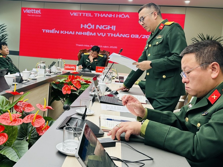 Sáng ngày 12/03/2026, Viettel Thanh Hóa tổ chức Hội nghị sơ kết công tác tháng 02/2026 và triển khai nhiệm vụ sản xuất kinh doanh tháng 03/2026. Hội nghị do Thượng tá Hoàng Mạnh Hiền Bí thư Đảng ủy, Giám đốc Viettel Thanh Hóa chủ trì, với sự tham dự của Ban Giám đốc cùng lãnh đạo các phòng ban, đơn vị và các Viettel Cụm trên địa bàn tỉnh.